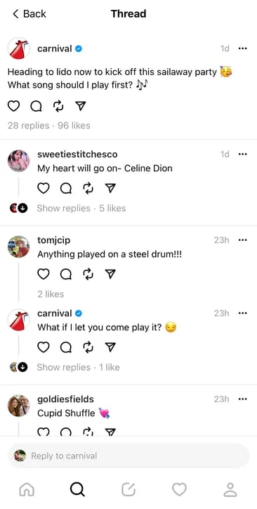 Brands like Scrub Daddy, Spotify, Carnival Cruise Line and even Wendy’s have been early adopters when it comes to Threads and can provide invaluable insights for your marketing journey. By analyzing their content, engagement strategies, and brand interactions, you can glean ideas and tactics that are already working well on Threads.